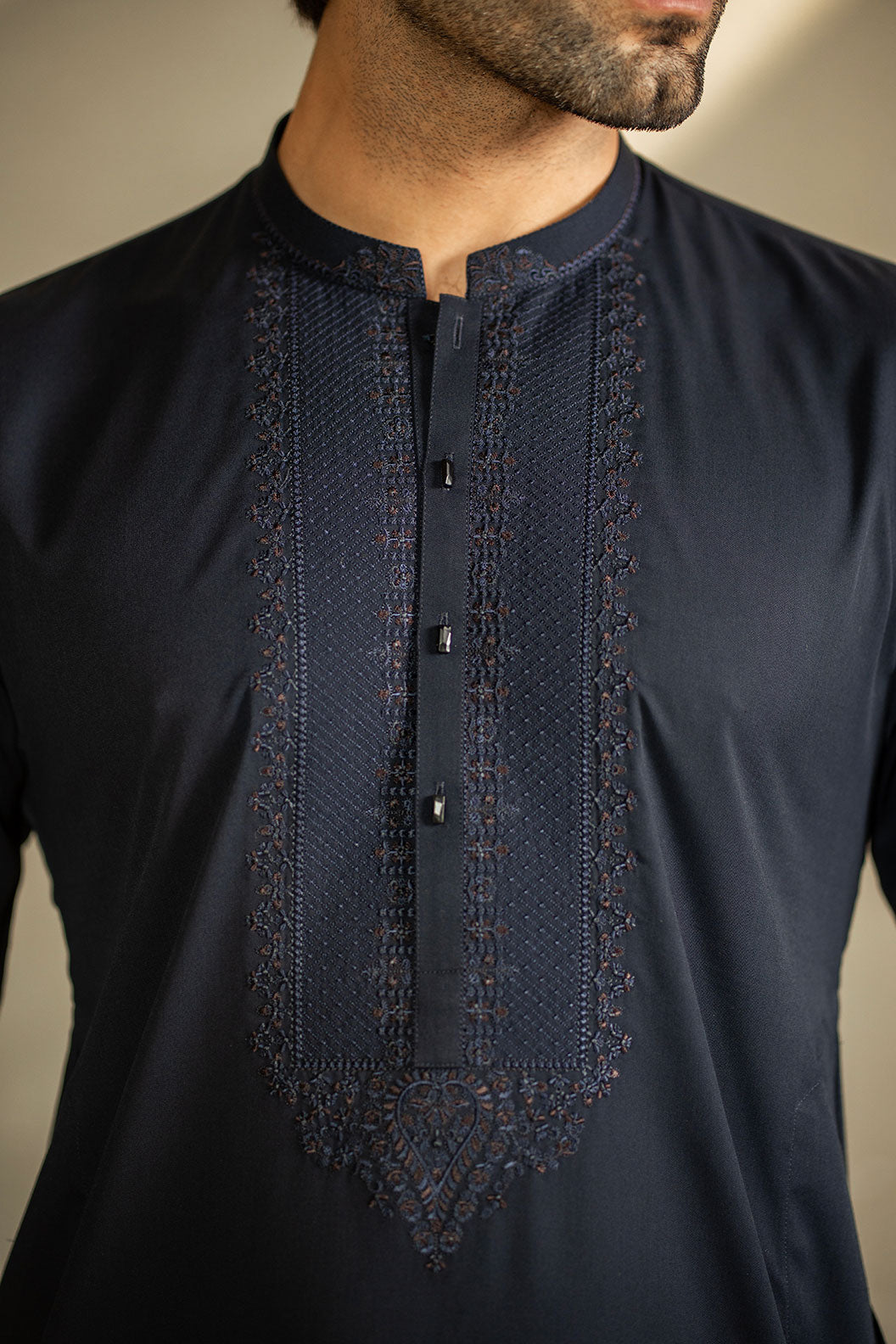 Our Navy Blue Embroidered Kurta Trouser C-10214 is made with a premium fabric. This Men's Kameez Trouser combines comfort, style, and elegance with its classic design. The unique blend ensures durability, providing a perfect fit for any occasion.