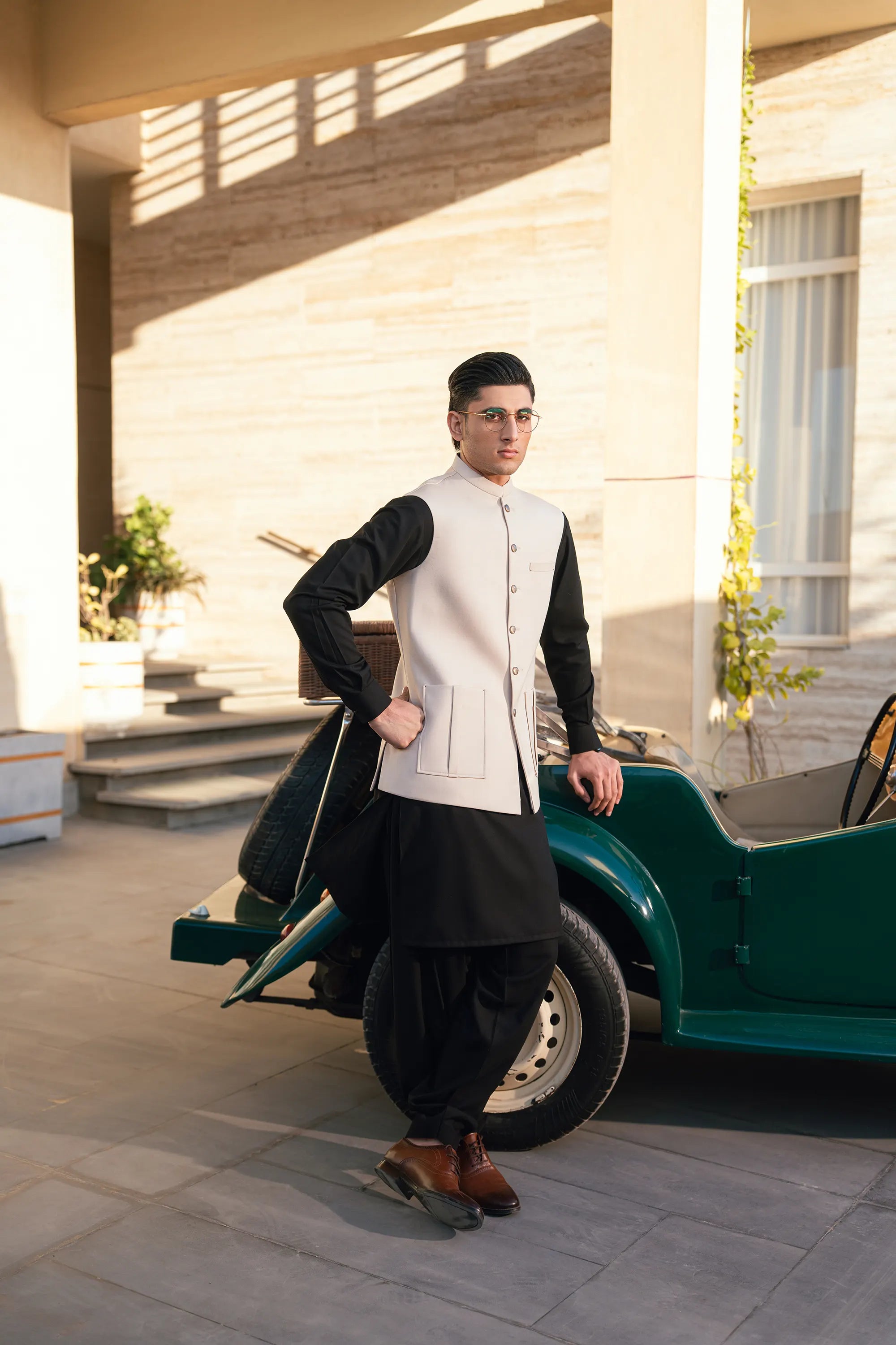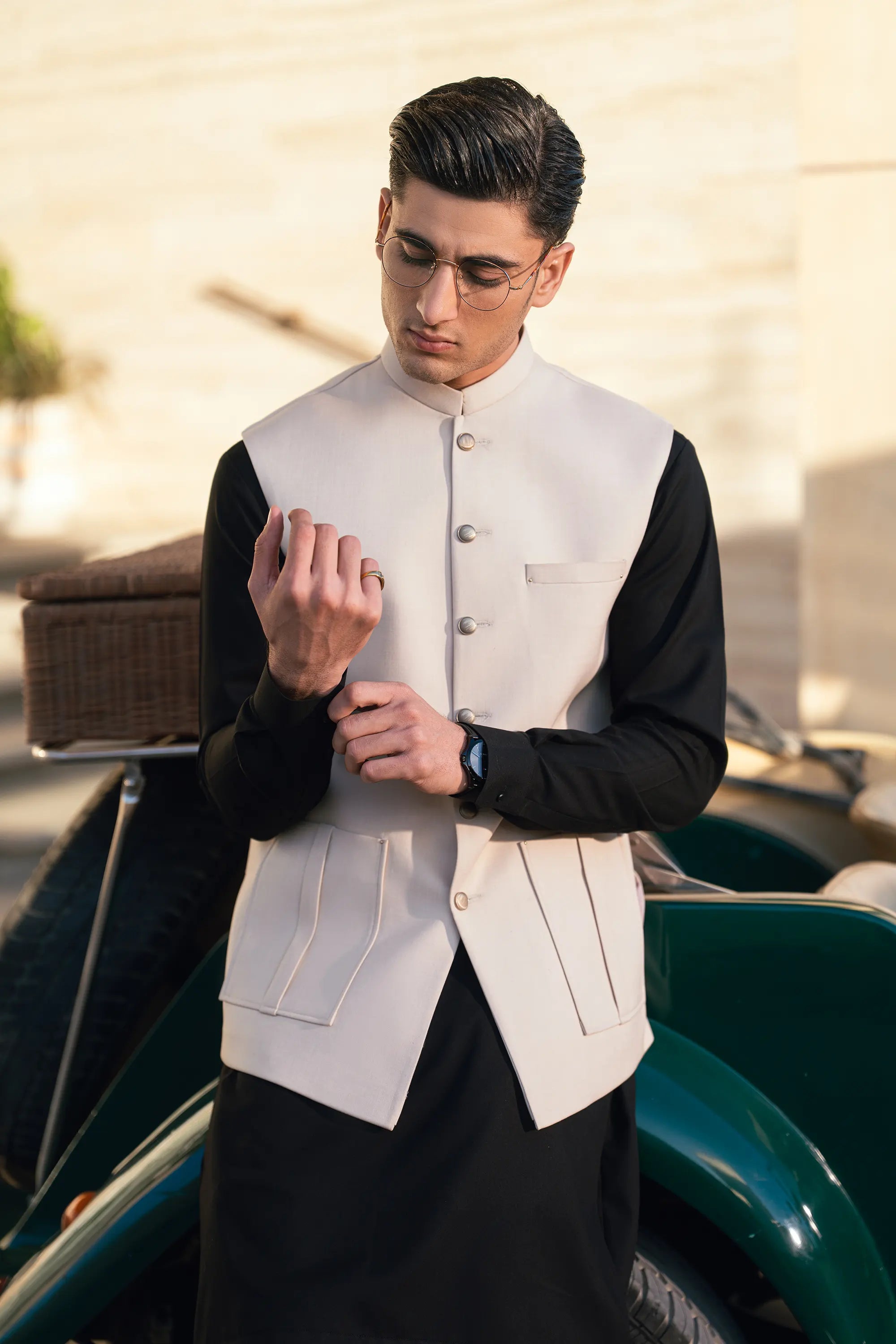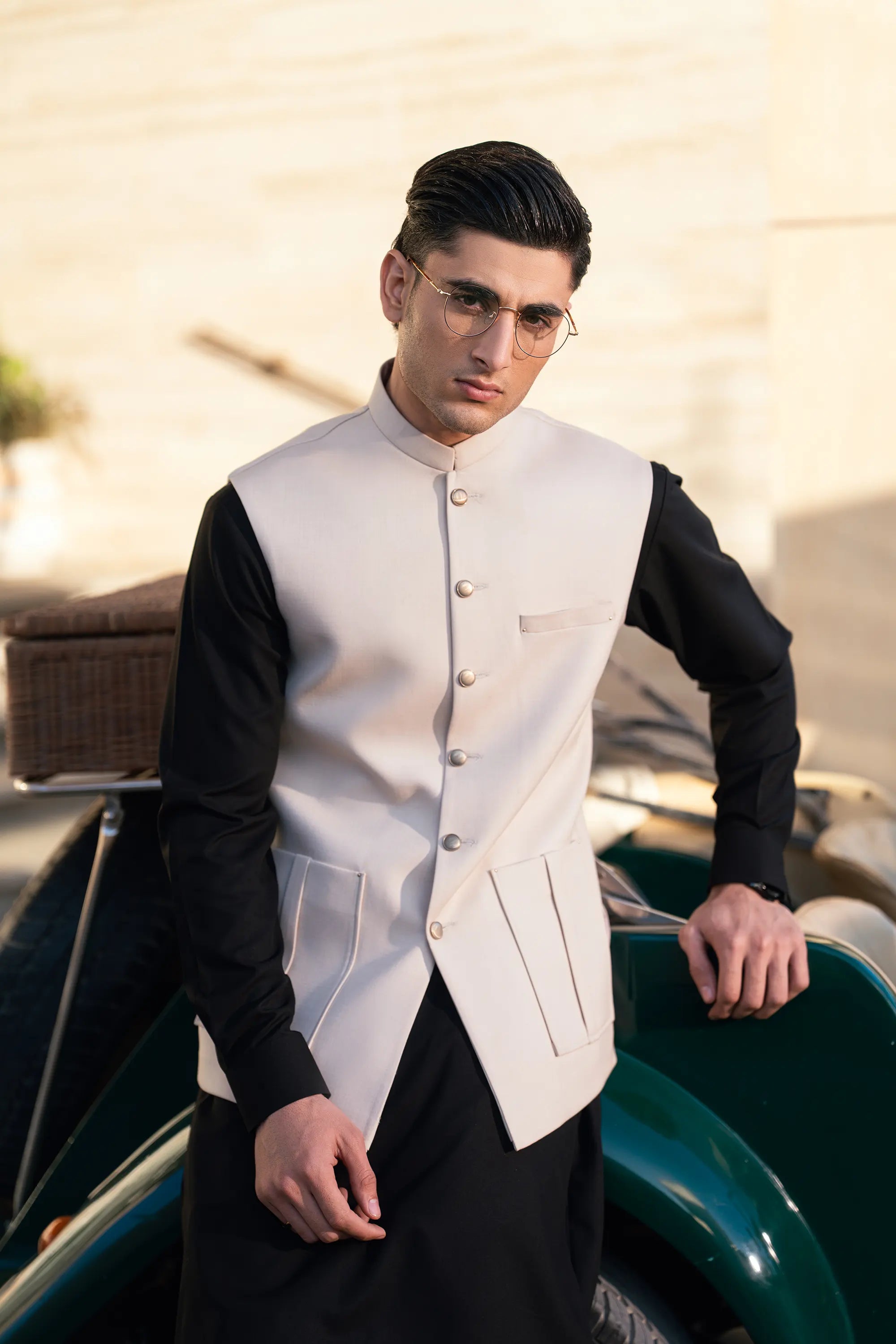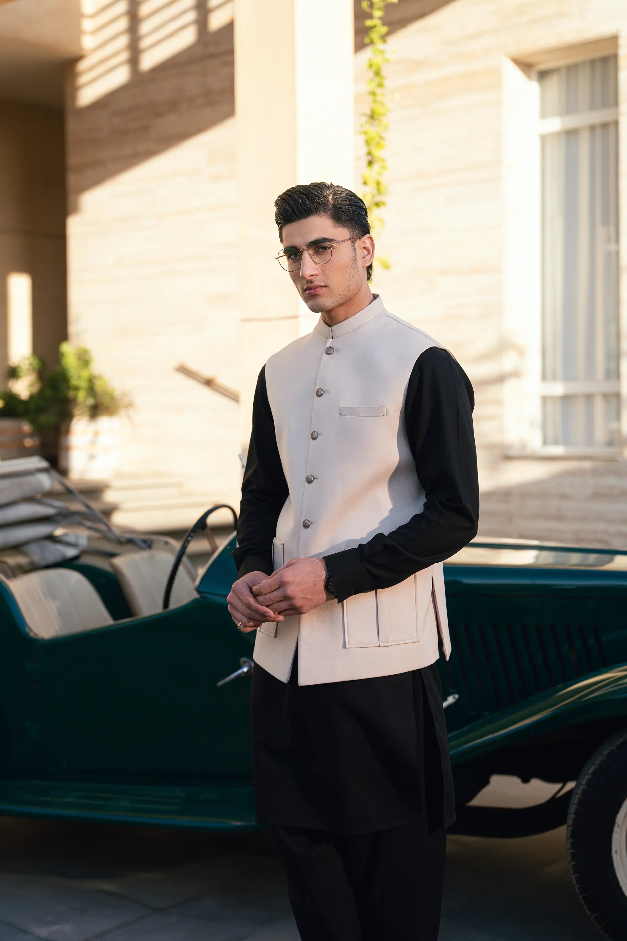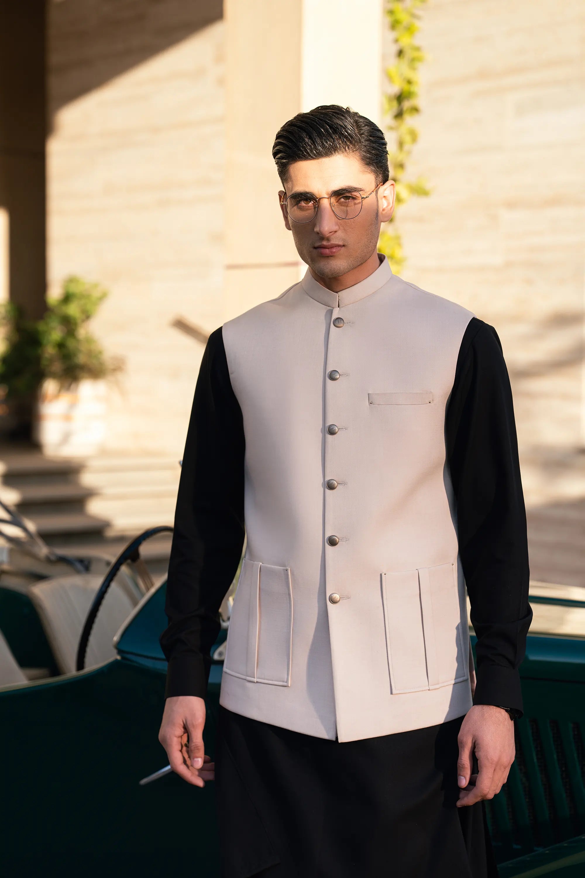 - The fabric of the waistcoat is blended suiting.