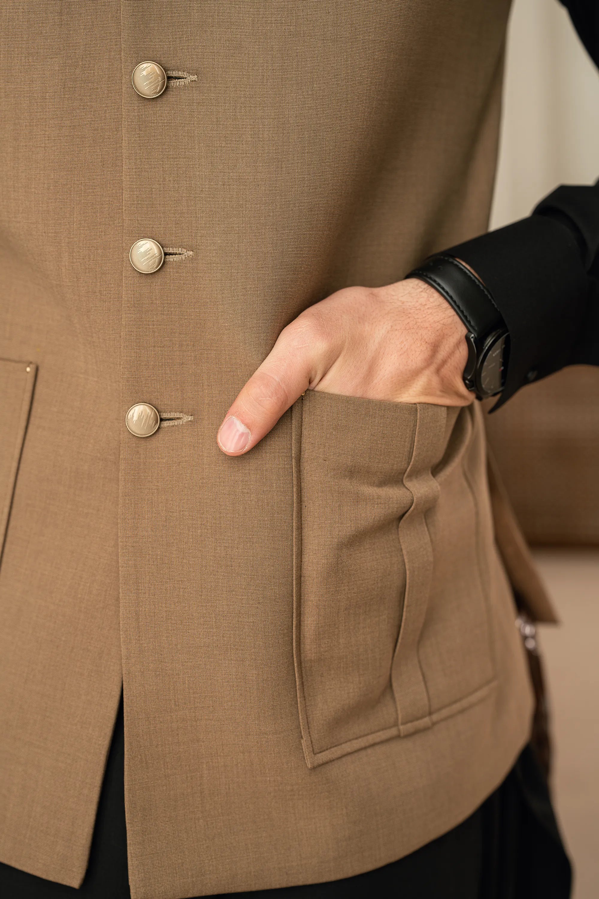 - The fabric of the waistcoat is blended suiting.